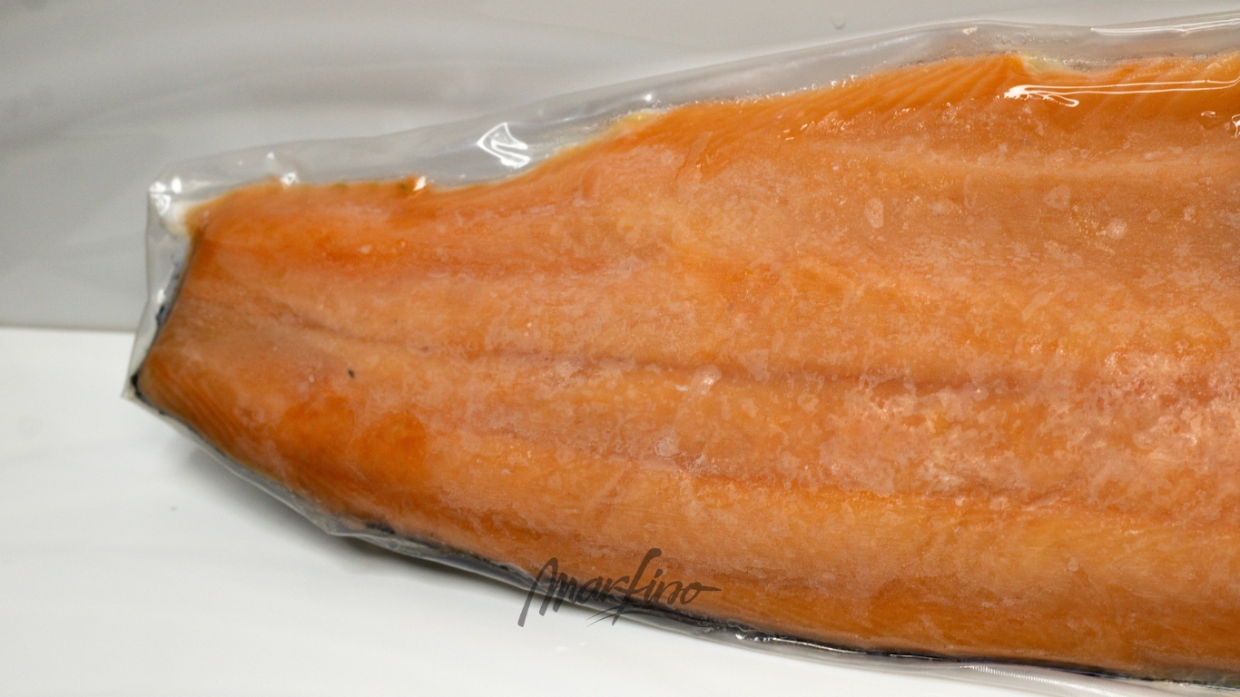 Filete de salmón atlántico congelado, con piel, Trim D, sin espinas, sellado al vacío individualmente, calibre entre 900-1300 gramos aproximadamente.